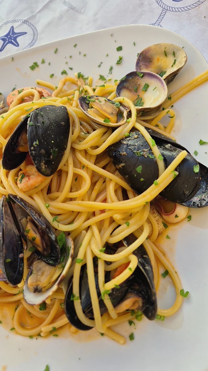 we enjoyed an amazing meal here tonight for our first time in Terrasini! Beautiful view, delicious fresh pasta and fresh seafood. Prices are reasonable and they give you a nice portion. We ordered the seafood pasta and Zuppa di Cozze. Grazie Mille!